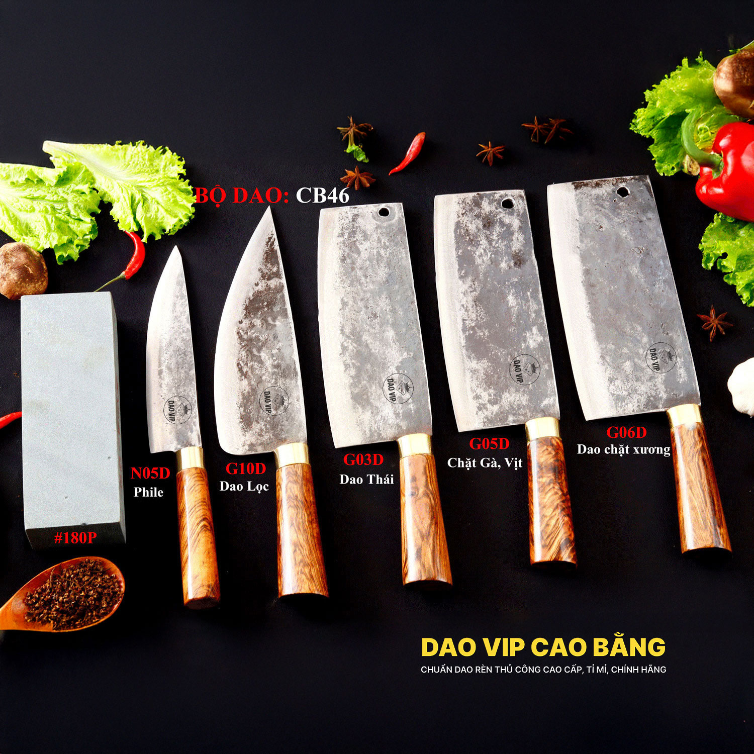 - BỘ DAO BẾP CB46 cán cẩm. được rèn thủ công từ thép nhíp xe ô tô nga, thép nhíp đỏ, nhíp ifa nguyên khối. BỘ DAO BẾP CB46 cán cẩm sản phẩm rất thích hợp và được sử dụng để thái rau, thịt....cho vết cắt đẹp, ngọt, mịn mà và vuông vắn, đạt thẩm mỹ cao. đáp ứng tất cả các công việc bếp liên tục ngày như chặt xương, chặt gà vịt, thái thịt, rau củ quả, lọc, róc thịt cá, cắt tỉa hoa quả.....