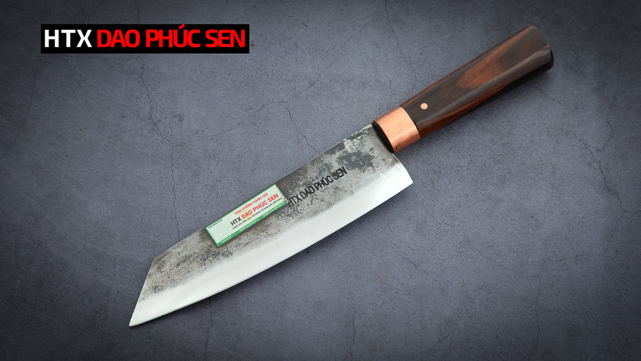 Dao được rèn từ thép nhíp ô tô, một loại thép có hàm lượng carbon cao, rất thích hợp cho dao bếp.