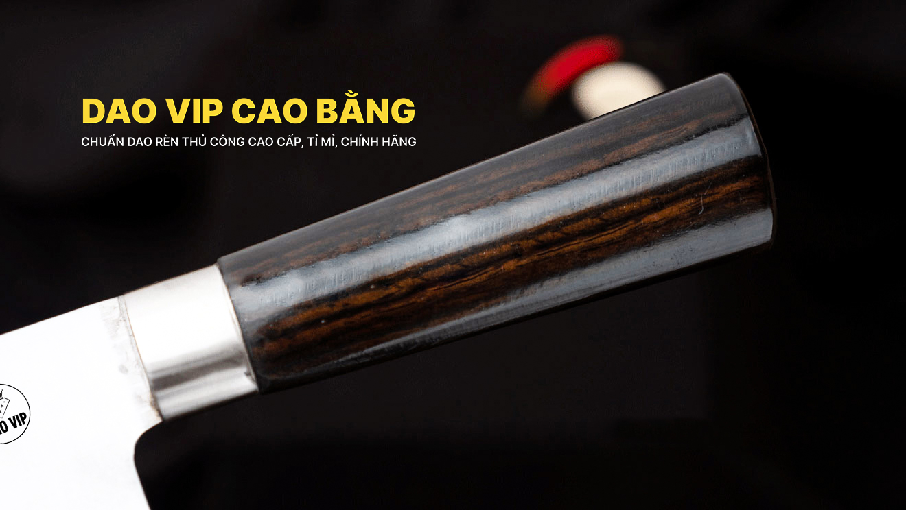 Phần cán dao thép trắng cán Dao thái lọc - TKM được làm từ gỗ mun là loại gỗ thường được sử dụng trong sản xuất đồ nghệ thuật. Bên cạnh tính thẩm mỹ thì độ dai bền của gỗ mun là yếu tố hàng đầu để DAO VIP CAO BẰNG lựa chọn nguyên liệu làm cán dao. Do đặc thù dao bếp khi sử dụng phải thường xuyên căng thẳng nước nên với ưu điểm không mục, không bơm nước như các loại gỗ thông thường, cộng với kỹ thuật chế tạo, cẩn thận của kỹ thuật viên trong đoạn công đoạn cần cán gỗ đảm bảo độ bền và an toàn tuyệt đối cho người sử dụng.